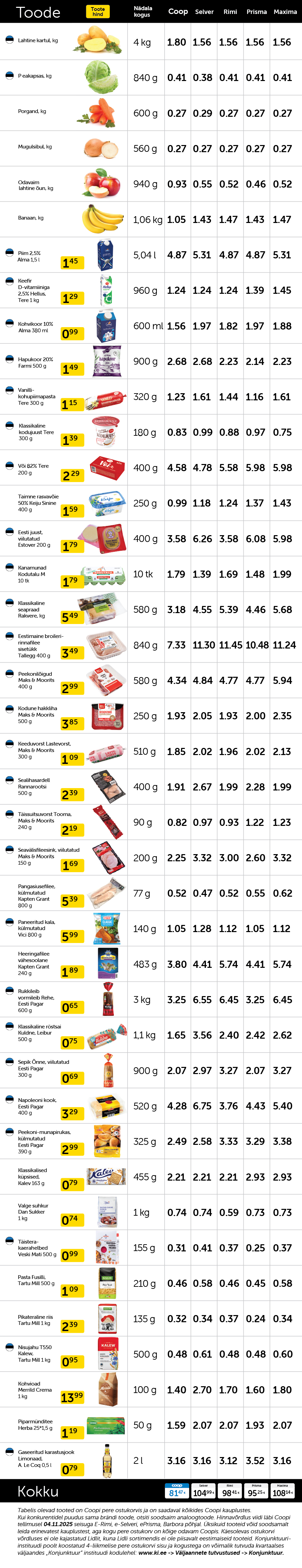 Coop arvutab oma keti pere ostukorvi hinda vastavalt Eesti Konjunktuuriinstituudi koostatud neljaliikmelise pere ostukorvi sisule ja kogustele. Valik hõlmab kõiki põhitooteid kartulist-kapsast piima, leiva, munade, lihatoodete ja magustoiduni. Võrdluses ei ole kasutatud iga kategooria kõige odavamat toodet vaid toite, mida inimesed Coopi näitel vastavas kategoorias ka päriselt kõige rohkem poest ostavad. Hinnavõrdlus viidi läbi kõikides suuremates jaekettides.
