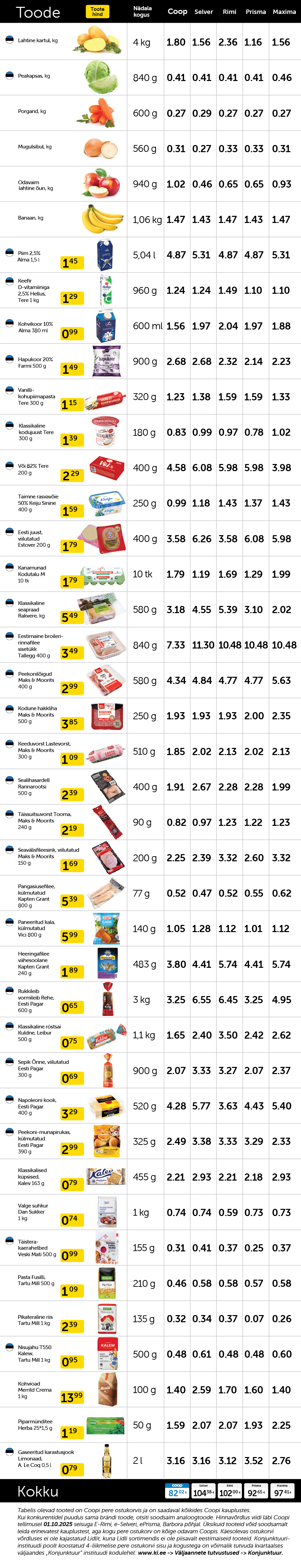 Coop arvutab oma keti pere ostukorvi hinda vastavalt Eesti Konjunktuuriinstituudi koostatud neljaliikmelise pere ostukorvi sisule ja kogustele. Valik hõlmab kõiki põhitooteid kartulist-kapsast piima, leiva, munade, lihatoodete ja magustoiduni. Võrdluses ei ole kasutatud iga kategooria kõige odavamat toodet vaid toite, mida inimesed Coopi näitel vastavas kategoorias ka päriselt kõige rohkem poest ostavad. Hinnavõrdlus viidi läbi kõikides suuremates jaekettides.